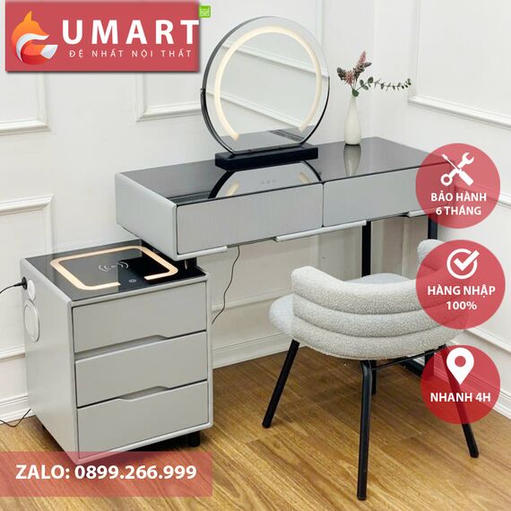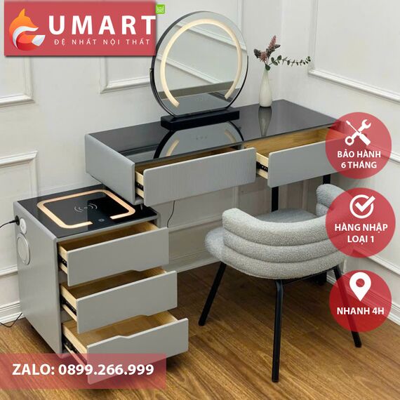 Sản phẩm gồm: bàn phấn, tap thông minh (đèn led đổi màu, sạc không dây, loa bluetooth), gương led cảm biến, chân bàn, dụng cụ lắp ráp