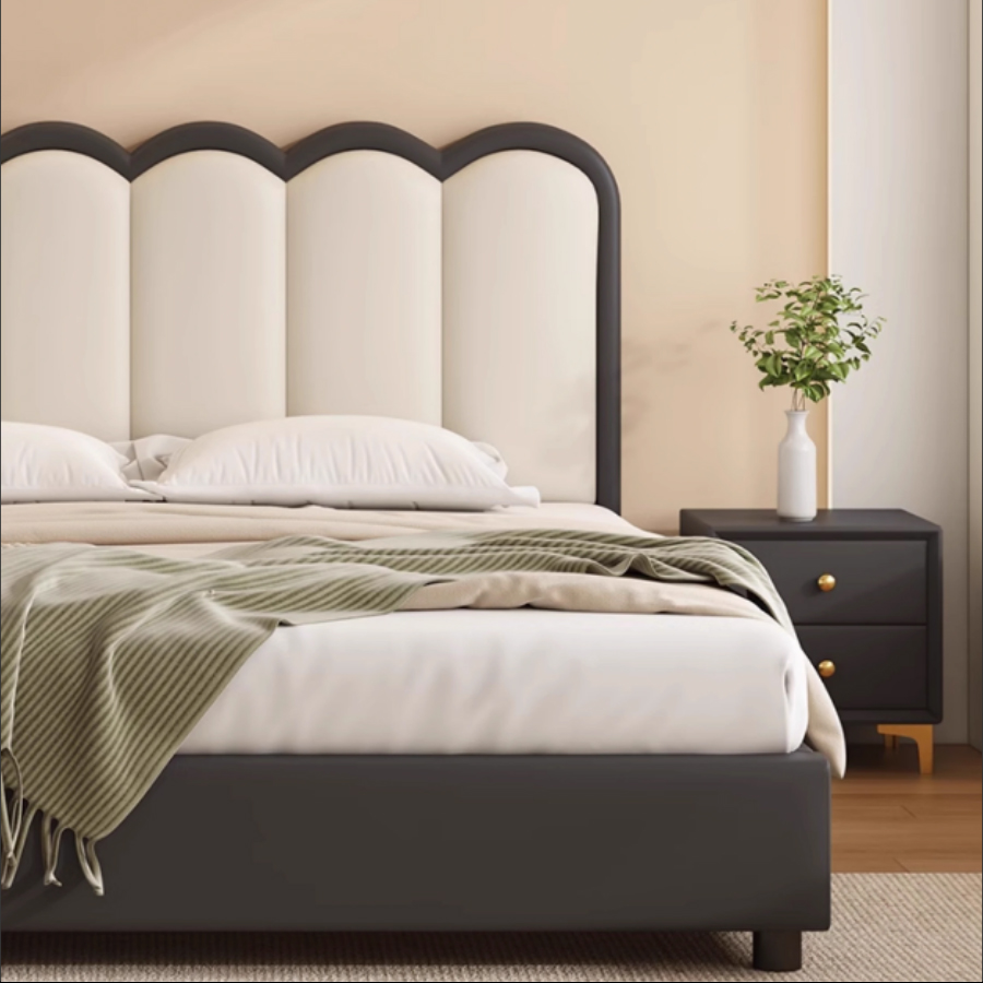 Điểm đắt giá nhất của GN-1005 chính là phần tựa lưng (Headboard). Các đường cong lượn sóng được tạo hình thủ công tỉ mỉ, kết hợp với đường viền đậm màu tạo nên hiệu ứng thị giác mạnh mẽ. Nó không chỉ là một chiếc giường, mà là một món đồ Decor đắt giá.