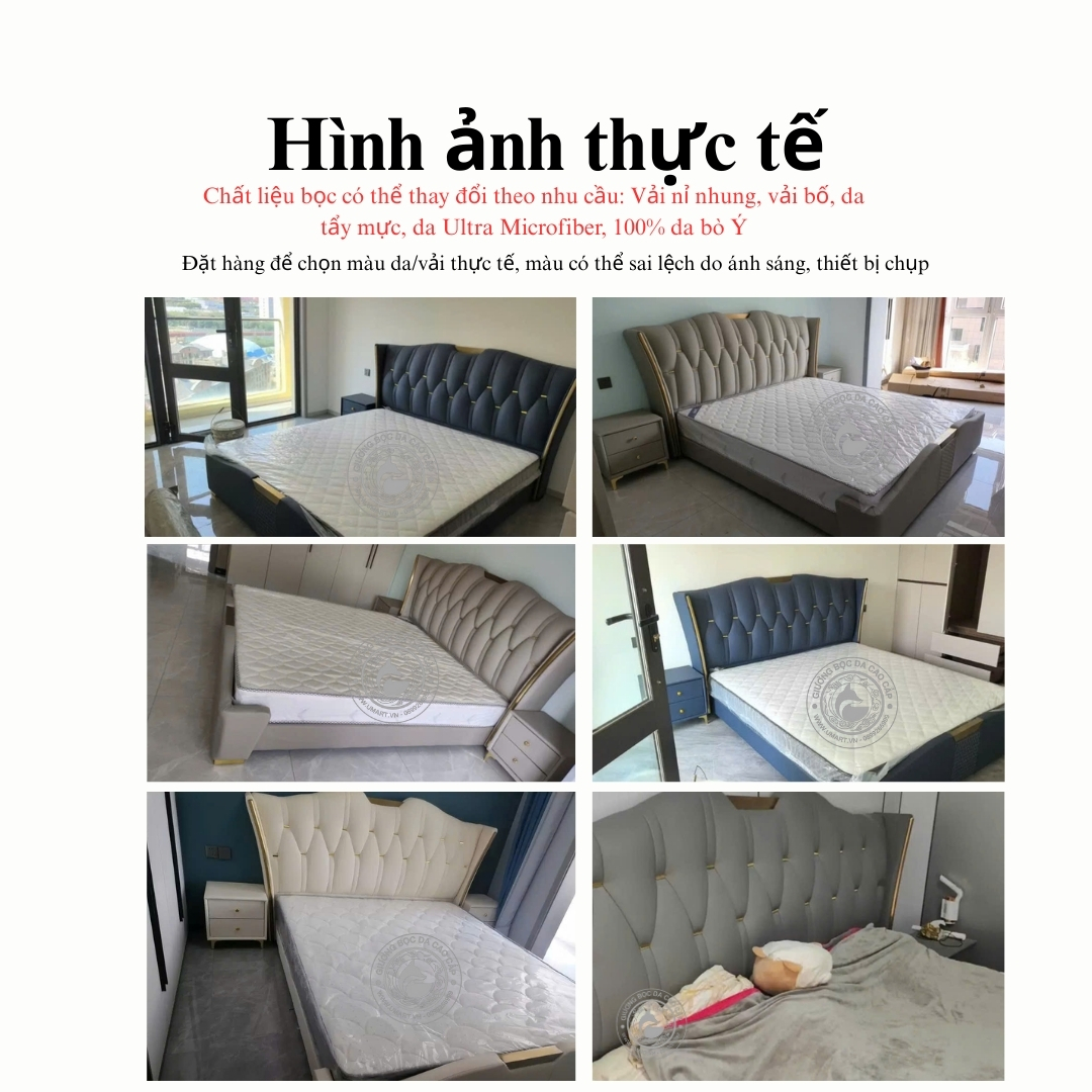 - Chất liệu: Gỗ tự nhiên, Plywood kết hợp mút xốp cao cấp bọc da/vải tùy chọn.
