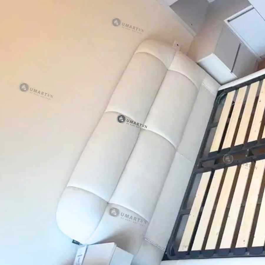 - Đệm Bồng Bềnh - Êm Ái Tuyệt Đối: Toàn bộ khung giường và đầu giường được bọc đệm dày dặn, bồng bềnh, tạo cảm giác mềm mại như những đám mây. Bạn có thể thoải mái tựa lưng đọc sách hay thư giãn mà không cần thêm gối tựa.