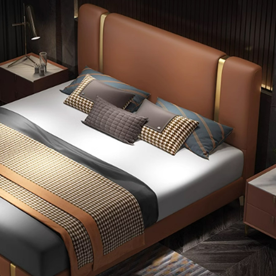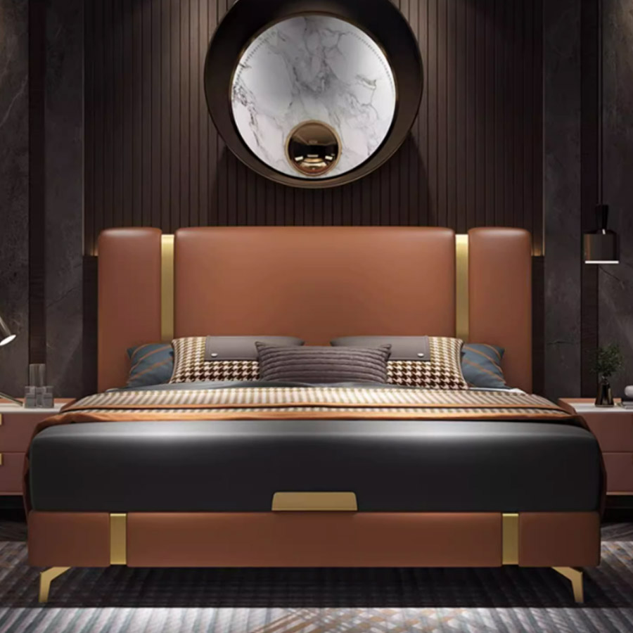 - Thiết kế hiện đại, độc đáo: Giường GN-1282 gây ấn tượng mạnh mẽ với đầu giường khối vuông vắn, kết hợp hoàn hảo giữa hai tông màu da tương phản và các chi tiết viền kim loại mạ vàng sang trọng. Thiết kế chân cao độc đáo không chỉ tạo vẻ ngoài thanh thoát mà còn giúp việc vệ sinh gầm giường dễ dàng hơn.